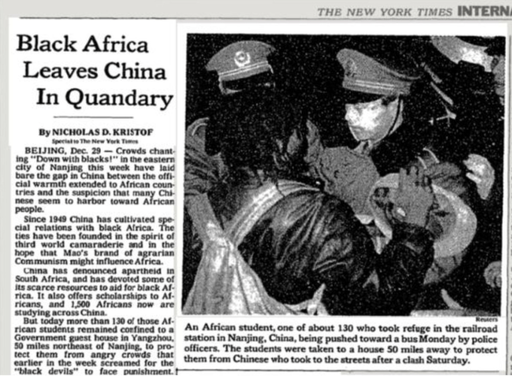 As the China-African specialist Winslow Robertson has cogently summarized, the 1970s and 80s saw a disturbing wave of racist violence and harassment directed against African students studying in China in response to complaints about their “loud music” and unfounded rumors that African men were raping Chinese women. In one particular incident in Shanghai in 1979, as many as 50 foreign students were injured as furious Chinese stormed the international dorms and assaulted their residents with makeshift weapons, and after a similar incident took place in Tianjin in 1986, African diplomats lobbied Beijing to secure better protection for their students but were rebuffed. In 1988, officials constructed a wall around the foreign students’ dorm at Nanjing’s Hehai University and forced them to register all guests so as to prevent Africans from bringing Chinese women to their rooms, and that December, some 300 Chinese students attacked the foreign dorm chanting “kill the black devils!” after rumors began circulating that an African killed a Chinese student. Shortly after the convulsion in January 1989, one young Chinese man was quoted saying of Africans: